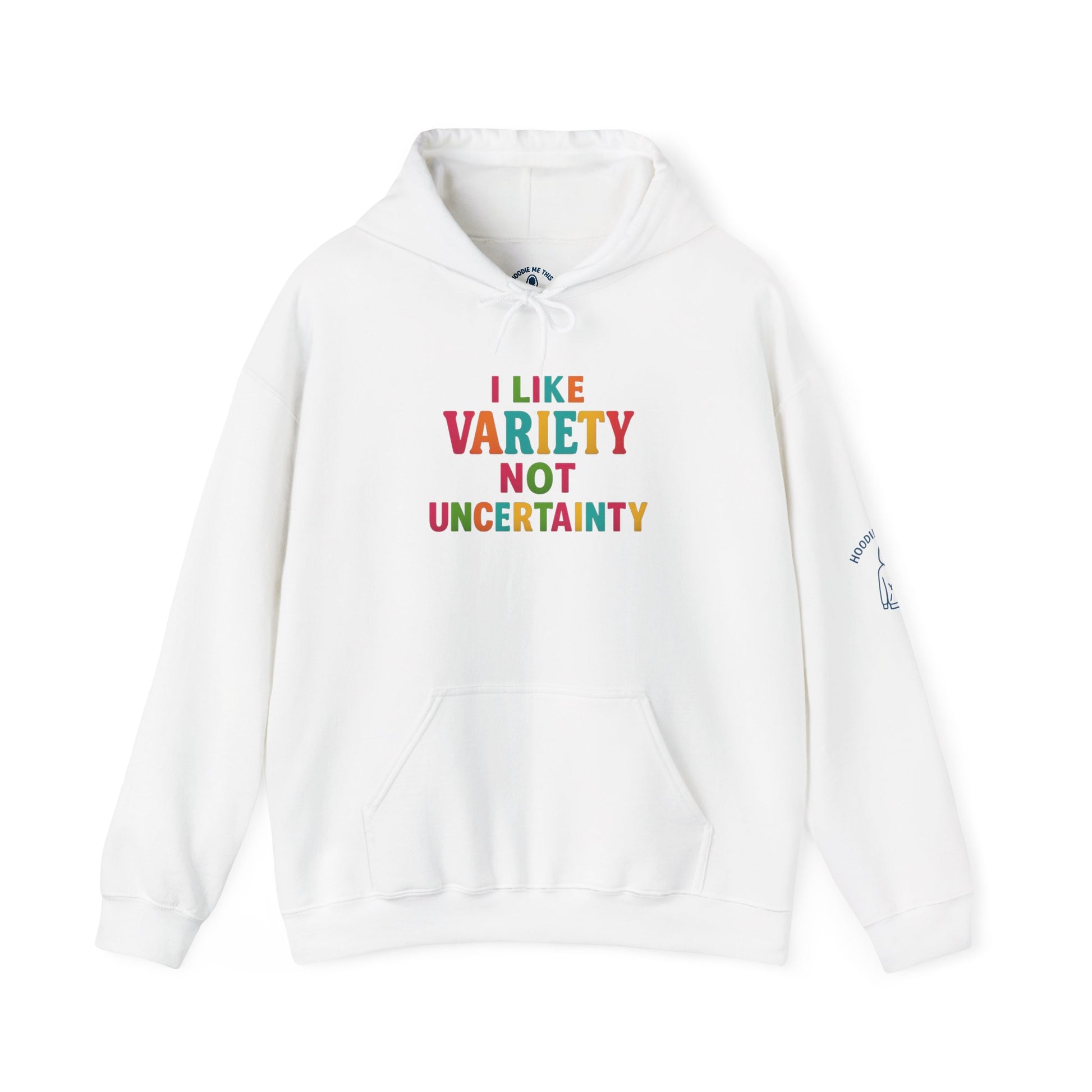 Introducing the perfect companion for chilly days. I LIKE VARIETY NOT UNCERTAINTY - Unisex Heavy Blend™ Hooded Sweatshirt. This cozy hoodie brings warmth and style together, making it ideal for layering during any casual outing. With its spacious kangaroo pocket, you can easily keep your hands warm or store essentials while on the go. The warm and inviting feel of this sweatshirt makes it a must-have for your wardrobe, whether you're curled up on the couch or hanging out with friends. This hoodie is perfect for individuals who appreciate comfort, quality, and style, making it suitable for everyone, from students to parents. It’s an excellent choice for holidays, cozy winter gatherings, or casual celebrations. Celebrate your unique style and warmth with this versatile piece!